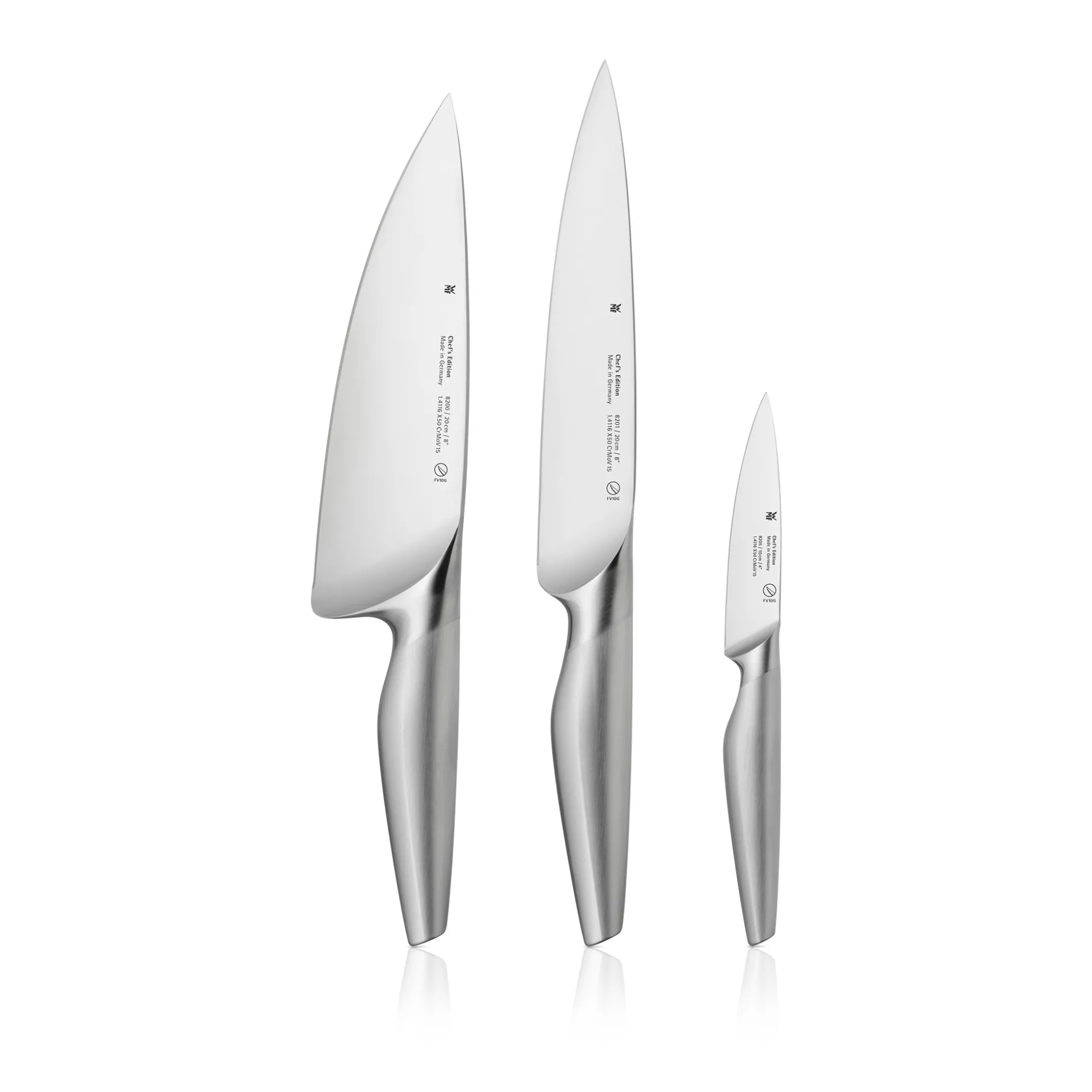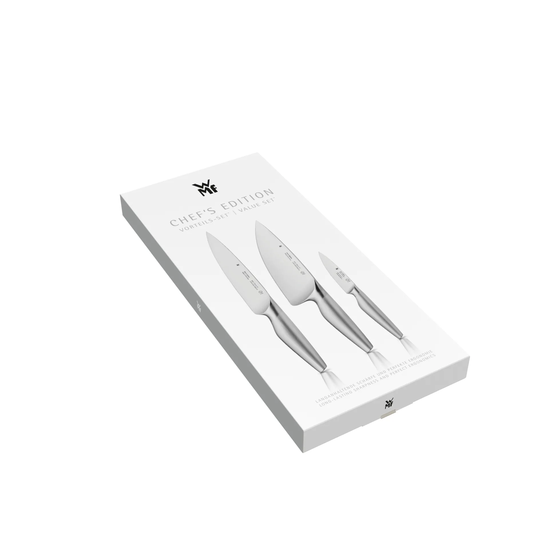 Fließende, fugenlos-hygienische Übergänge, dank des geschmiedeten Kropfs perfekt ausbalanciert und mit einer Formgebung, die speziell auf die Griffhaltung und Schneidetechnik von Küchenprofis ausgerichtet ist: Das ist die Chef’s Edition von WMF. Die Messer begeistern mit ihren handgeschmiedeten Klingen aus korrosions- und säurebeständigen Spezialklingenstahl, dem ergonomischen Griff aus hochwertigem Cromargan® und dem sicheren, komfortablen Handling. Veredelt mit dem einzigartigen WMF Performance Cut, einem Verfahren, das eine optimierte Wärmebehandlung mit modernster Laser- und Roboter-Präzisionstechnologie für unerreicht spitze Schleifwinkel kombiniert, bewahren die Klingen ihre überragende Schärfe über einen langen Zeitraum. Dieses 3-teilige Chef’s Edition Messer-Set besteht besteht aus einem Kochmesser, einem Fleischmesser sowie einem Spick- und Allzweckmesser.