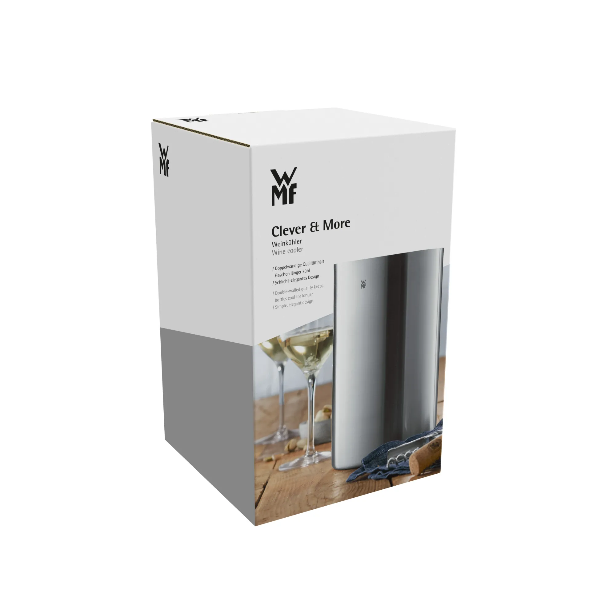 Langlebige Qualität für stilvolle Momente, ob am Esstisch oder auf der Terrasse, beim entspannten Lesen eines guten Buches oder der Feier mit Familie und Freunden: Der Clever & More Weinkühler von WMF in edlem, stilvollen und zeitlosen Design sorgt dabei für perfekt gekühlten Wein, Champagner, Softdrinks oder Wasser, kann problemlos aber auch als Eiswürfelbehälter eingesetzt werden. Seine doppelwandige Ausführung ermöglicht eine sehr gute Isolierleistung und hält Flaschen ganz ohne Kühlakku oder Eis für lange Zeit schön kühl und frisch. Gefertigt aus genauso strapazierfähigem wie edlem Cromargan®: Edelstahl Rostfrei 18/10, ist der Weinkühler besonders pflegeleicht und darf zur Reinigung gerne auch in die Spülmaschine. Damit reiht er sich nahtlos in die WMF Kollektion Clever & More mit ihren nützlichen und stilvollen Utensilien für den Haushalt ein.