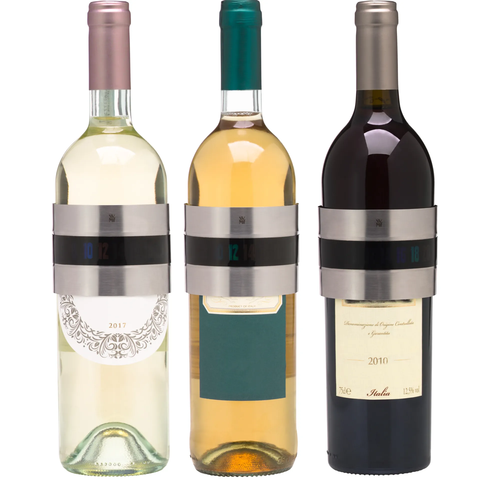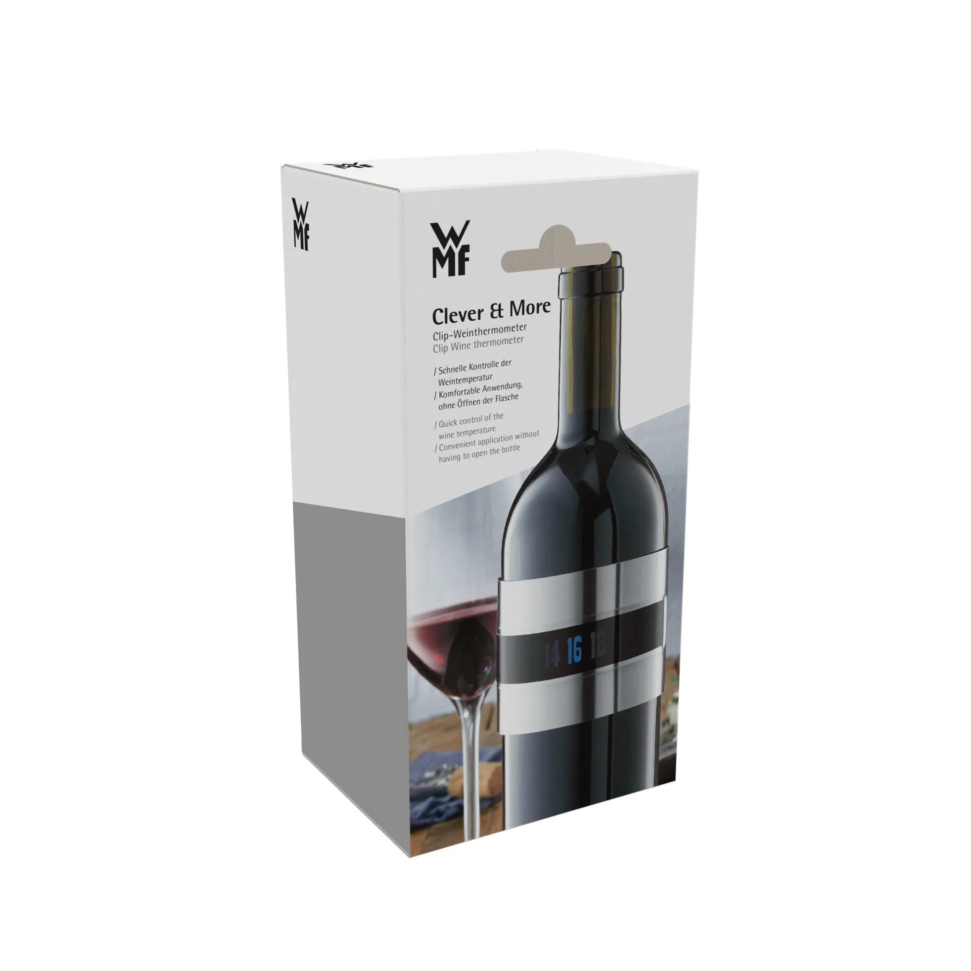 Um das volle Aroma und Potential eines Weines auszukosten, empfehlen Winzer, Sommeliers und andere Weinexperten bestimmte Trinktemperaturen für die unterschiedlichen Weine und Gewächse. Je nach verwendeter Traube, Ausbauart und Alter werden Weißweine bei 6 bis 12 °C, Roséweine bei 11 bis 13 °C und Rotweine bei 13 bis 18°C genossen. Das Clever & More Weinthermometer von WMF macht Weinfreunden den Weg zur optimalen Trinktemperatur denkbar einfach. Einmal auf die Flasche geclippt, zeigt es im Handumdrehen die aktuelle Trinktemperatur auf dem einfach abzulesenden Display an. Damit reiht sich das Weinthermometer nahtlos in die WMF Kollektion Clever & More mit ihren nützlichen und stilvollen Utensilien für den Haushalt ein.