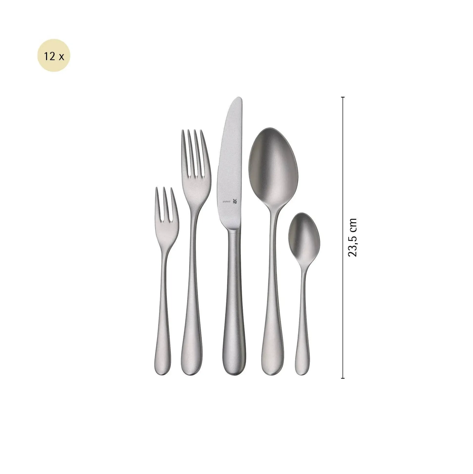 Das Besteck Merit von WMF verbindet gekonnt die Attraktivität zeitloser Formen mit der kompromisslosen Qualität moderner High-Tech-Materialien. Das klassische Design des Besteck-Sets für 12 Personen vermittelt eine angenehme Vertrautheit, während die sorgfältige Verarbeitung, die perfekte Ergonomie und der praktische Alltagsnutzen des Bestecks keine Fragen offen lassen. Dazu verfügt Merit über das patentierte Härteverfahren Cromargan protect® für eine außergewöhnliche und langanhaltende Widerstandsfähigkeit gegen Kratzer und Gebrauchsspuren. Die eingelegten Messerklingen bestehen aus rostfreiem, geschmiedetem und gehärtetem Spezialklingenstahl für langanhaltende Schärfe und Flexibilität. Gut ausbalanciert zwischen Griff und Klinge, bietet jedes Menuemesser eine angenehme Haptik und liegt perfekt in der Hand. Dieses exquisite Besteck mit sandgestrahlter Oberfläche überzeugt durch eine besondere Textur und verleiht jedem Tischarrangement eine edle Note. Das Merit Besteck-Set ist selbstverständlich zur mühelosen Reinigung spülmaschinenfest und wird in einem hochwertigen Besteckkasten zur sicheren, praktischen Aufbewahrung geliefert.