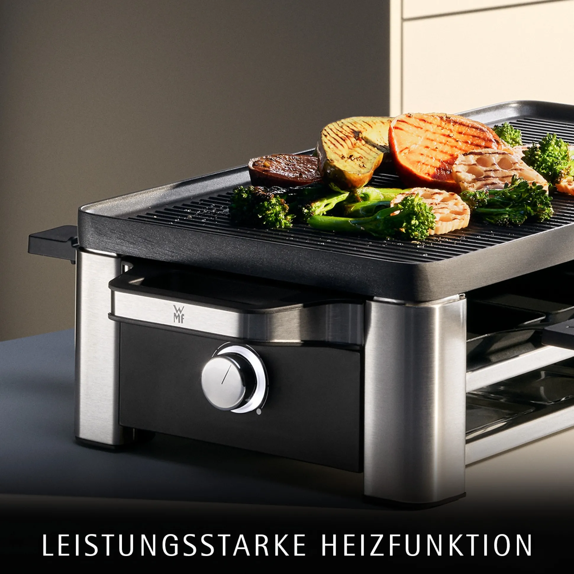 Gemeinsam am Tisch köstliche Festessen genießen: Der Lono Raclette Grill von WMF ist mit einer wendbaren Aluminiumgussplatte mit Antihaftbeschichtung ausgestattet, die sich sowohl für zartes Grillen als auch für die Zubereitung von Crêpes eignet. Von herzhaften Schmelzkäsegerichten bis hin zu süßen Köstlichkeiten wie gegrilltem Obst: Die Temperatur lässt sich für jedes Bedürfnis individuell einstellen. Das Raclette-Set für 8 Personen umfasst antihaftbeschichtete Pfännchen und hochwertige Spatel, beides spülmaschinengeeignet. Heiße oder unbenutzte Pfännchen lassen sich bequem in einem eigenen Fach ablegen. Die Lono Kollektion von WMF bietet praktische und leistungsstarke Geräte, die sich mühelos in jedes Küchenambiente einfügen. Bei ihren aus elegantem und dennoch robustem Cromargan® gefertigten Gehäusen, treffen klare Linien auf innovative Formen. Eine Kombination aus Leistung, Design und Langlebigkeit, wie sie für WMF Küchengeräte typisch ist.