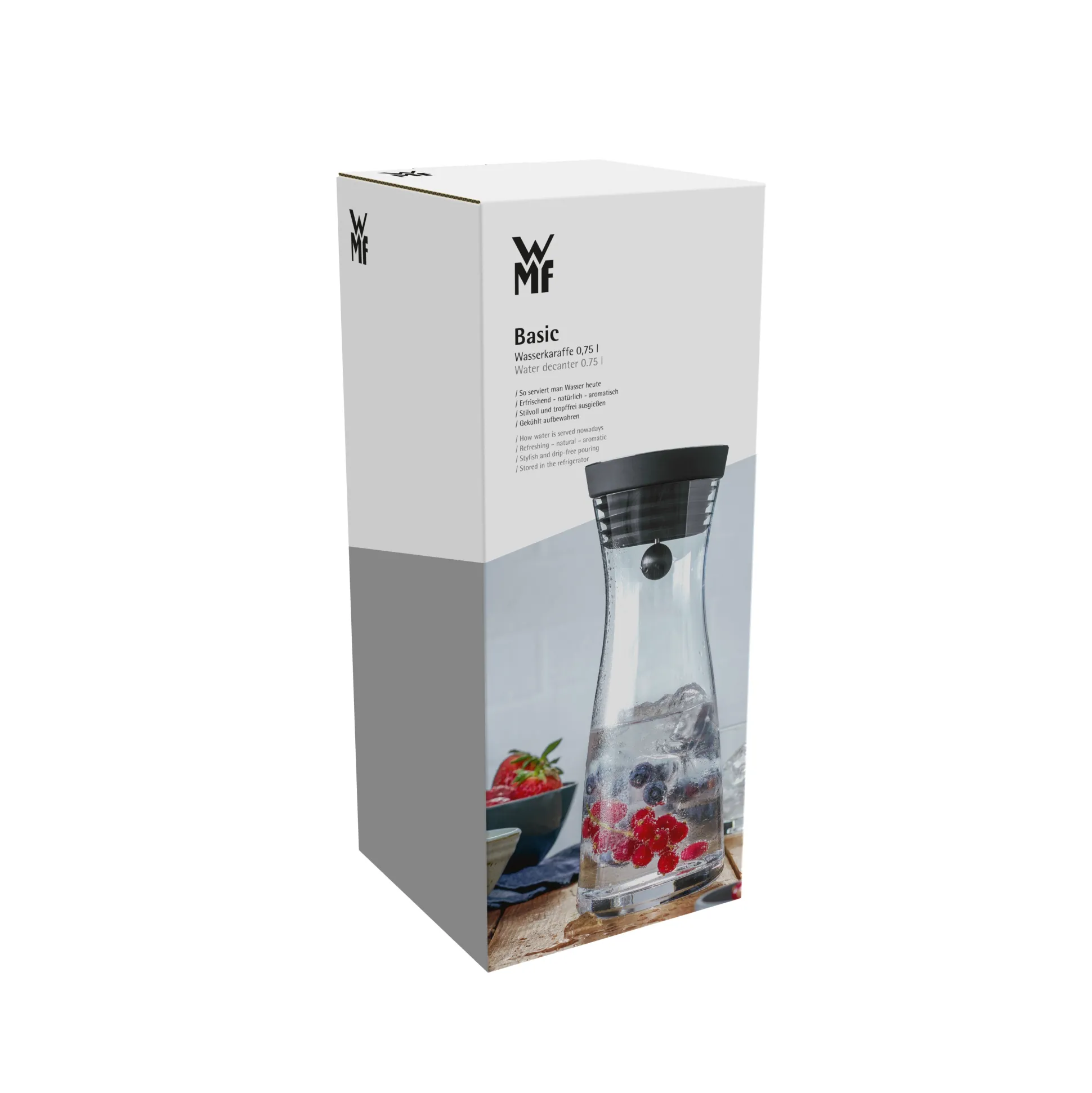 Mit oder ohne Kohlensäure, eisgekühlt oder zimmertemperiert, pur, mit fruchtiger Note oder aromatischen Kräutern – Wasser ist Vielfalt, Leben, Frische und Genuss. Statt unansehnlicher Getränkeflaschen, macht die Basic Wasserkaraffe mit 0,75 Liter Volumen von WMF mit ihrer klassisch-eleganten, schlanken Formgebung eine viel bessere Figur auf dem Tisch. Dazu liegt sie besonders angenehm und ergonomisch in der Hand und ist dank der großen Öffnung einfach zu befüllen. Ein genauso schönes wie praktisches Detail ist der schwarze CloseUp Verschluss: Dieser bietet einen cleveren Kippmechanismus, der sich beim Ausgießen automatisch öffnet und beim Absetzen wieder schließt. Dabei hält ein integriertes Sieb zuverlässig Eiswürfel, Fruchtstücke oder Kräuterzusätze zurück. Der Verschluss lässt sich zum Reinigen komplett zerlegen und in der Spülmaschine reinigen. Außerdem passt die Basic Wasserkaraffe platzsparend in das Getränkefach nahezu jeden handelsüblichen Kühlschranks.Die Kollektion Basic von WMF steht in Sachen Design für schlichte und moderne Eleganz, die dadurch perfekt in jedes Ambiente passt und problemlos mit vielen anderen Stilen kombinierbar ist. Hochwertige Materialien und beste Funktionalität sorgen für langlebige Produkte, die man gerne nutzt, durchdachte Zubehöre wie Reinigungsperlen oder Spülbürsten für Karaffen, Dekanter und andere Gefäße runden die Kollektion sinnvoll ab.